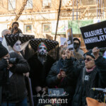 The protester is dressed warmly in a black faux-fur coat, black gloves, and dark pants, with their hair tied in a topknot. A septum piercing and large silver hoop earrings accentuate their look, adding to the bold and expressive presence they bring to the demonstration. Their closed eyes and soft smile convey a sense of calm confidence and resilience, embodying the spirit of the rally’s message.