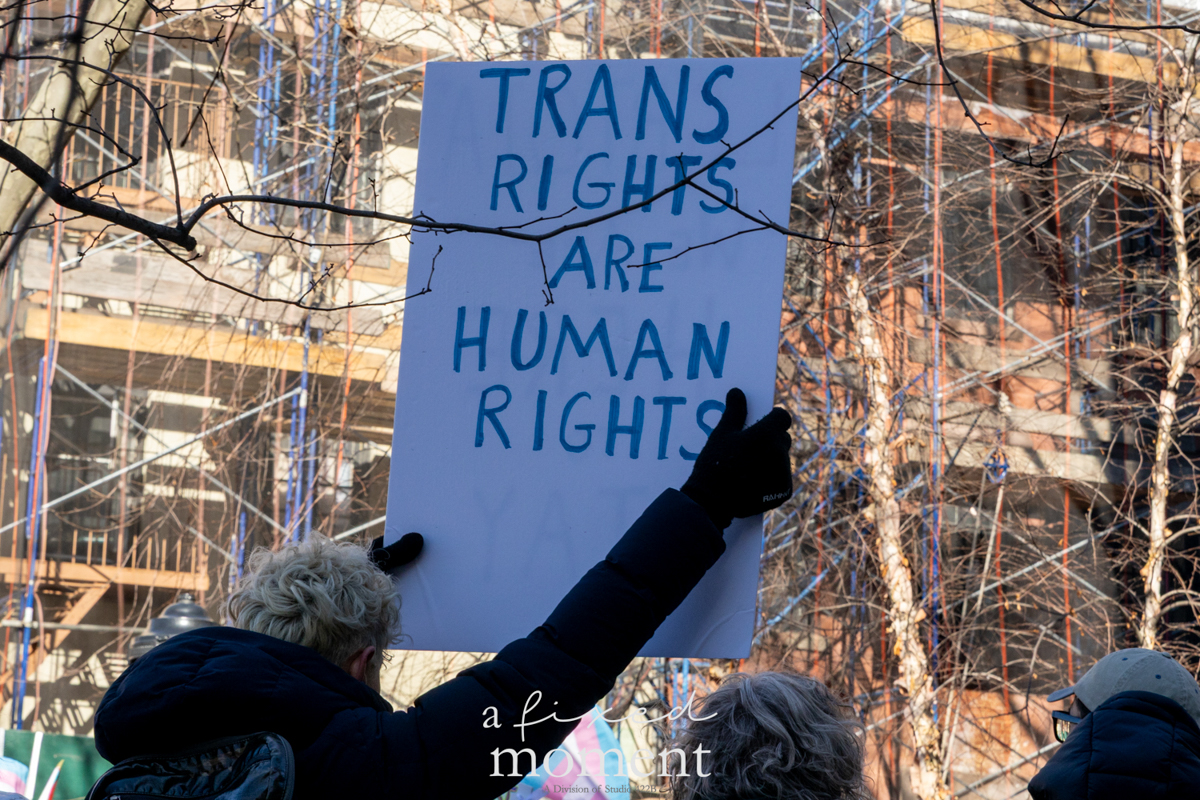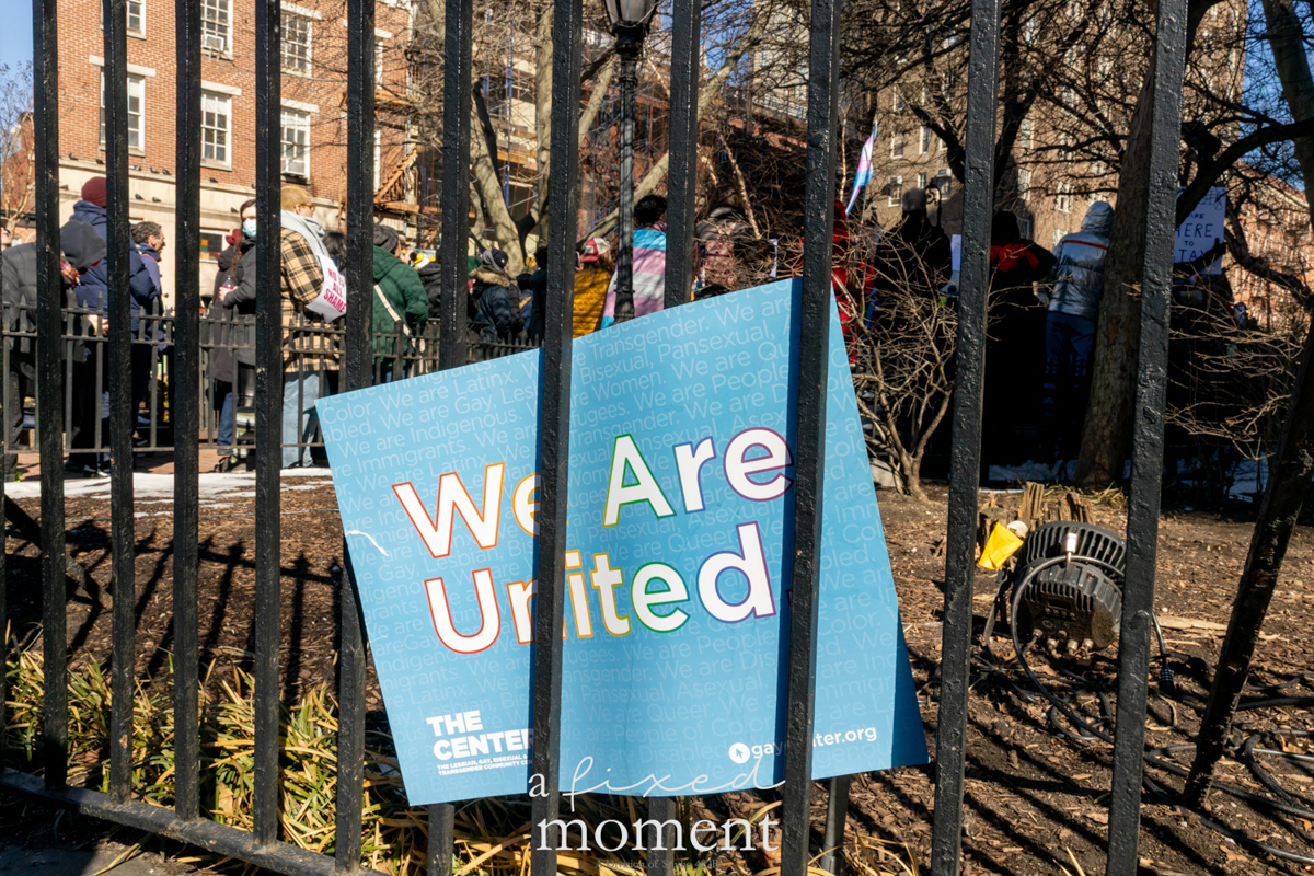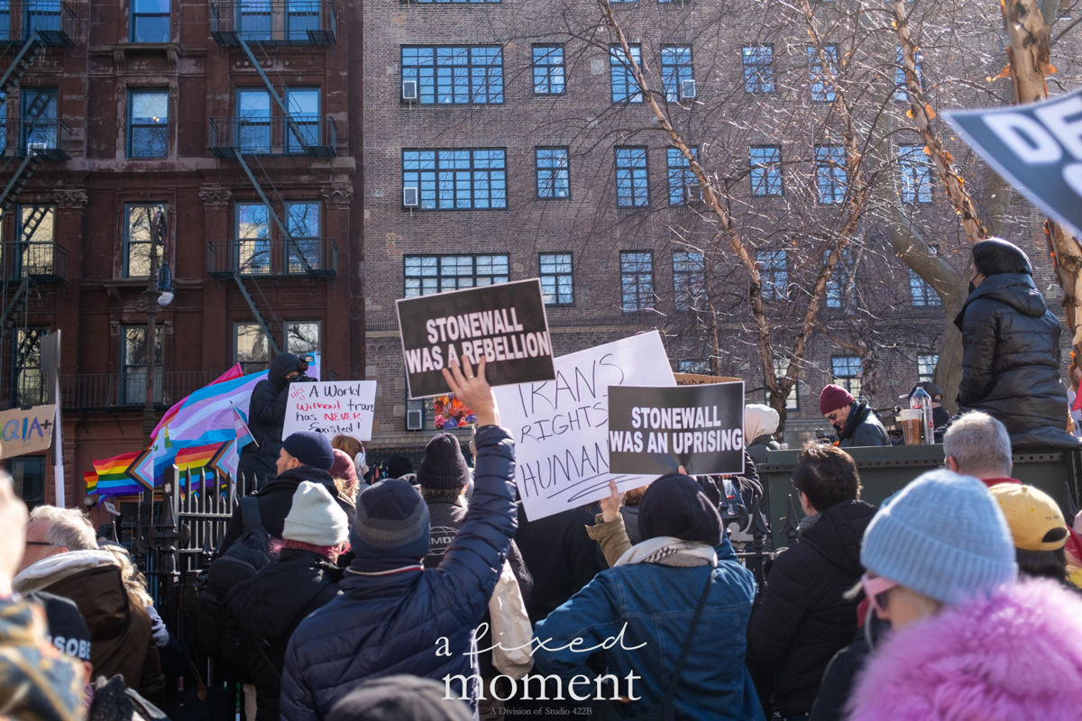 This image captures the energy and determination of the demonstrators as they stand together in defense of trans rights, honoring the legacy of Stonewall while demanding action in the present. The historic setting of Christopher Park, with its deep connection to LGBTQ+ resistance, adds a profound layer of meaning to the moment.