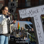 In the background, the historic Greenwich Village streets, scaffolding, and leafless trees frame the protest, highlighting the rally’s connection to Stonewall’s legacy of activism. The presence of trans pride flags, rainbow banners, and other political signs underscores the urgency of the movement.