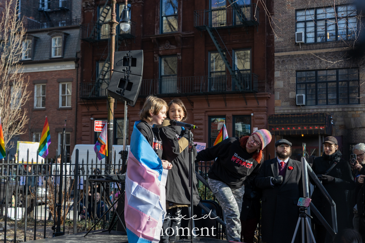 In the background, the historic Greenwich Village streets, scaffolding, and leafless trees frame the protest, highlighting the rally’s connection to Stonewall’s legacy of activism. The presence of trans pride flags, rainbow banners, and other political signs underscores the urgency of the movement.