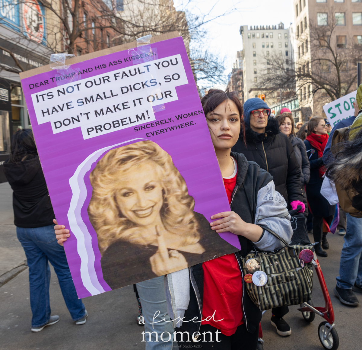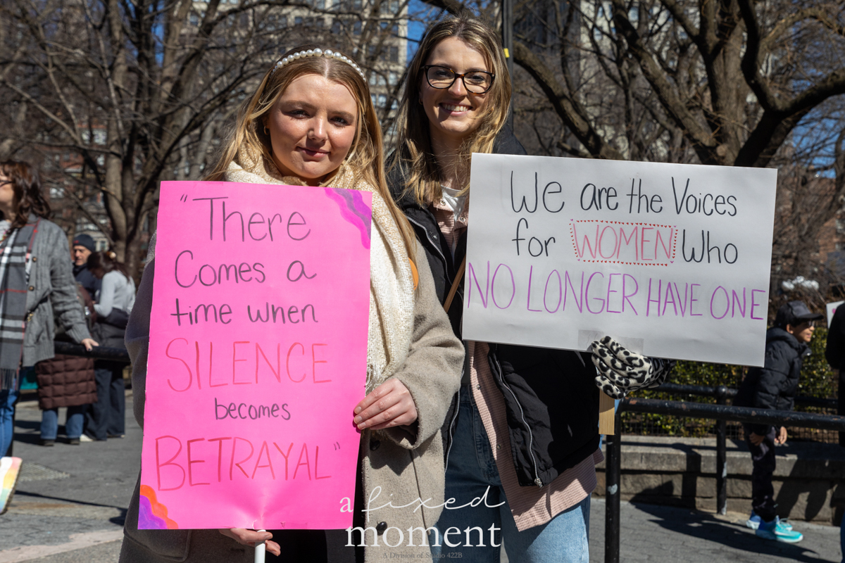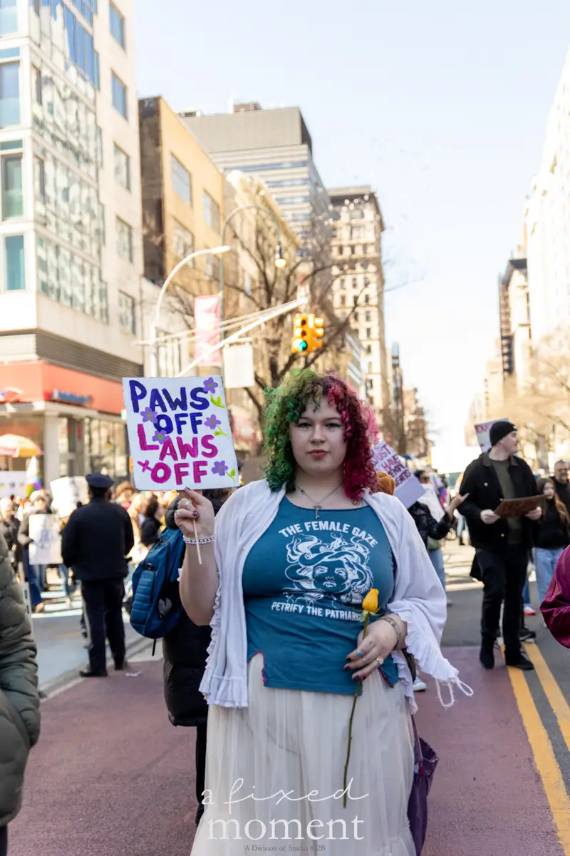 The individual is dressed in a colorful outfit, including a patterned tunic over bright pink leggings and black lace-up boots. They wear black gloves and dark sunglasses, with red lipstick accentuating their expression of determination. A red shawl is draped over their shoulders. The setting is filled with protesters, many engaged in conversations and holding various signs advocating for women's rights and social justice. The bright, clear sky enhances the scene of activism and solidarity.](https://afixedmoment.com/wp-content/uploads/cache/2025/03/MG_5757WM/2671597333.jpg)