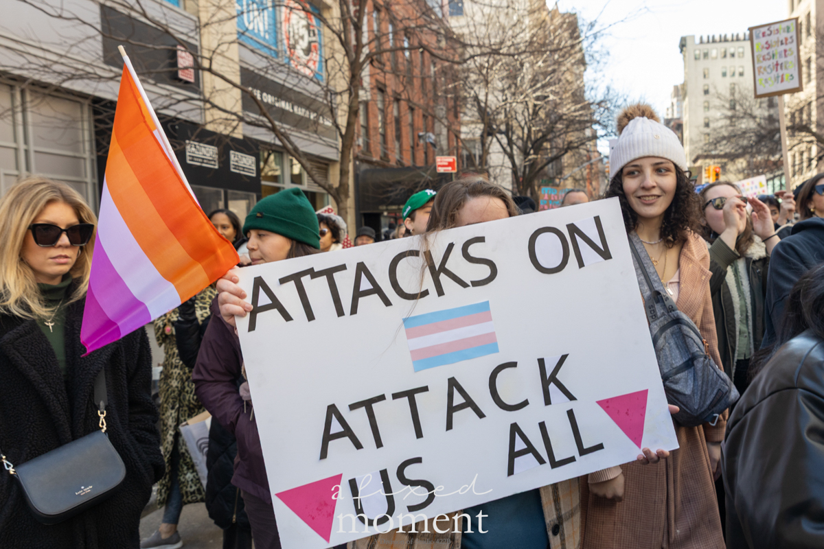 ![A demonstrator holds a bold protest sign reading "ATTACKS ON [trans flag symbol] ATTACK US ALL" with pink and blue triangles at the bottom, emphasizing solidarity with the transgender community. The marcher is surrounded by a diverse crowd advocating for LGBTQ+ rights, many carrying signs and banners. To the left, another participant waves a lesbian pride flag, while others wear winter attire, including beanies and sunglasses, braving the cold as they march through New York City streets. The atmosphere is charged with energy as people chant and display messages of unity and resistance.](https://afixedmoment.com/wp-content/uploads/cache/2025/03/MG_5551WM/1114093324.jpg)