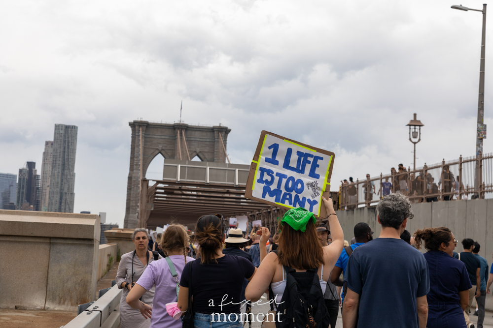 The march began at Borough Hall and continued across the Brooklyn Bridge, with thousands of people chanting and carrying signs demanding change. The energy was electric as participants marched through the streets, with cheers and chants of “enough is enough” and “not one more” filling the air.