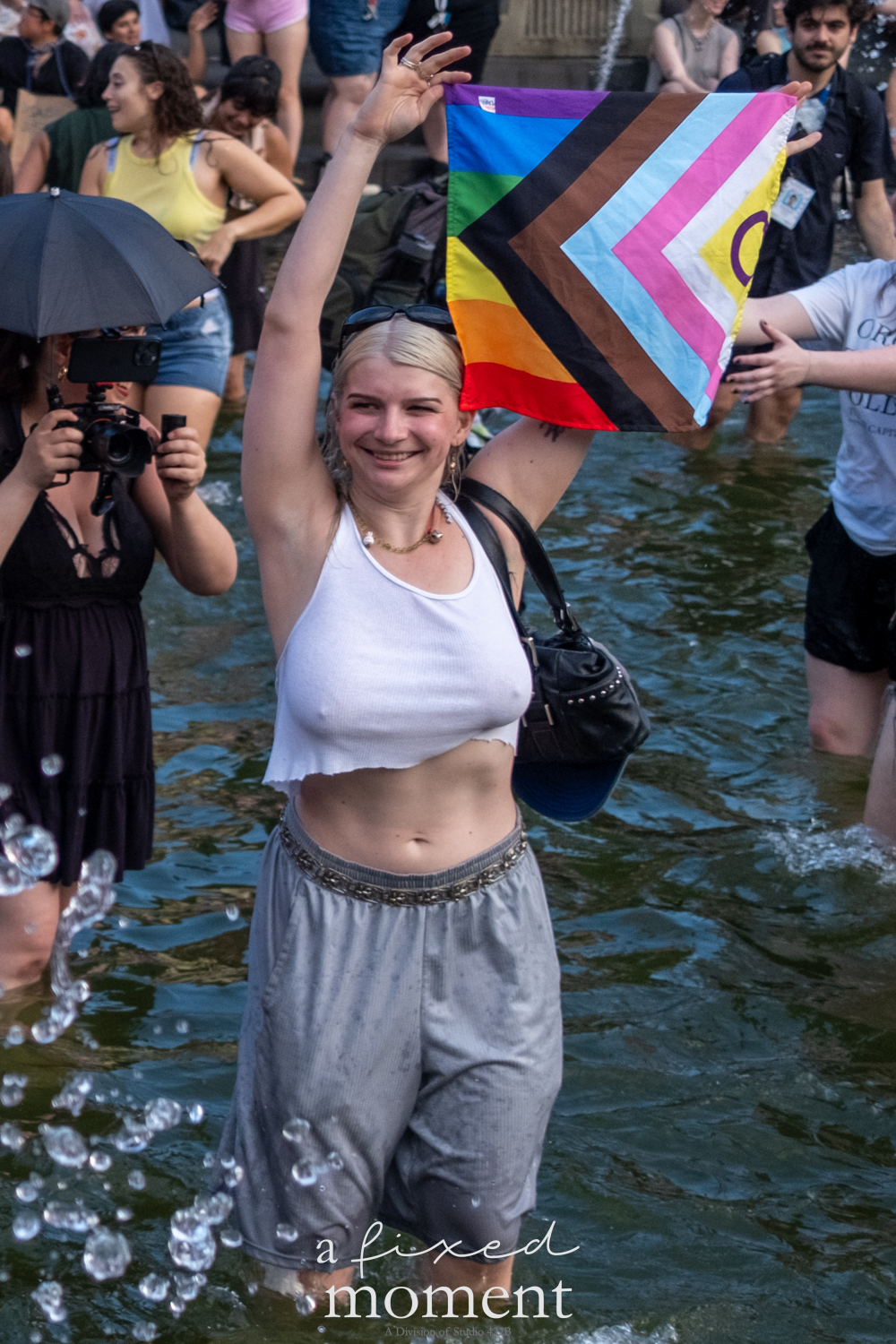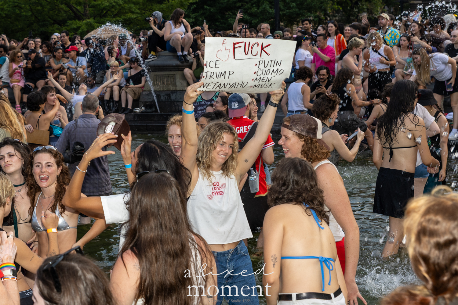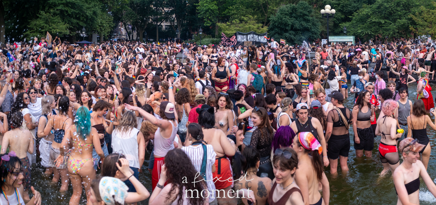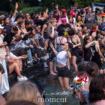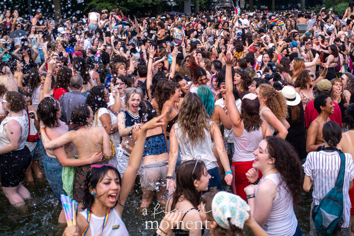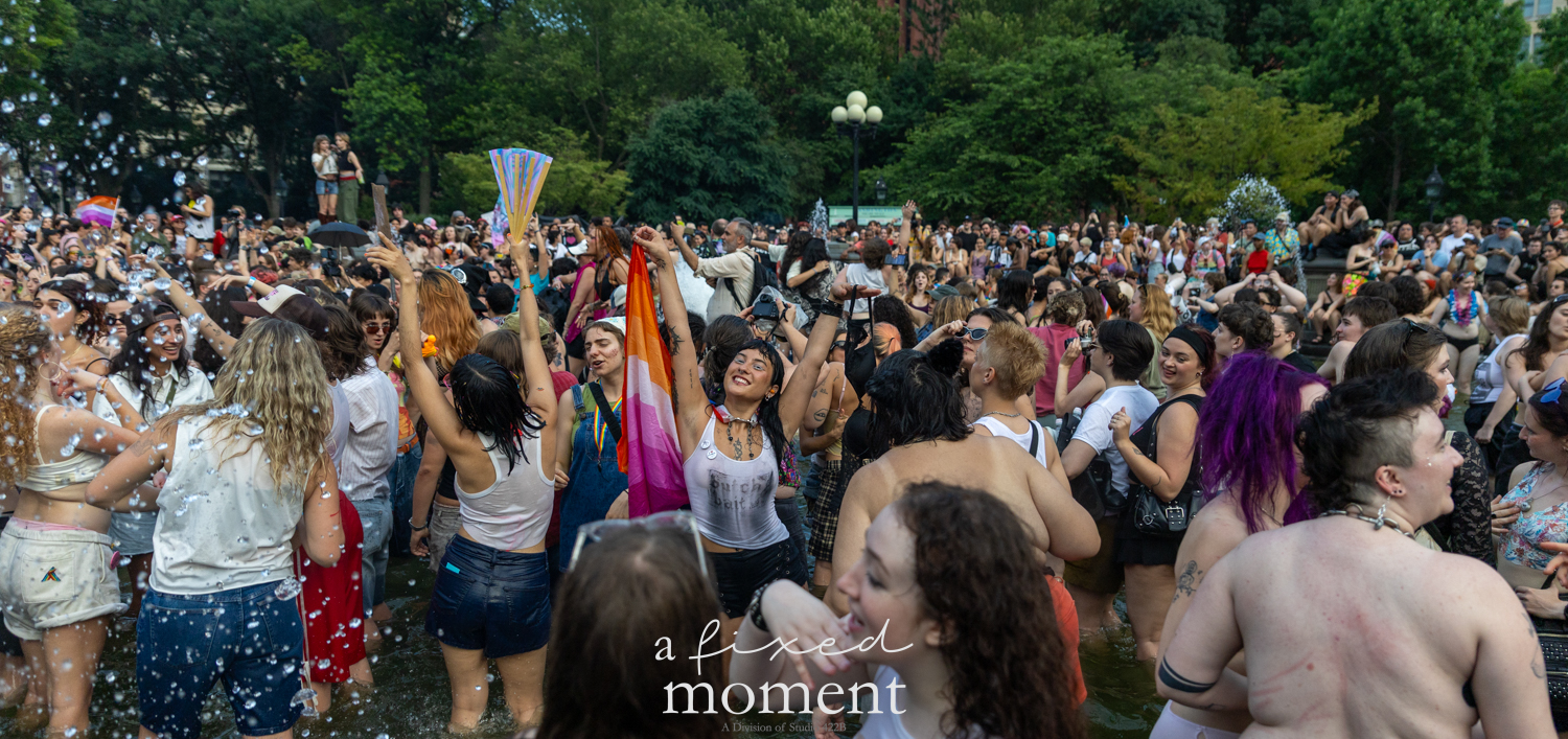 After the march, the spirit of resistance transformed into pure celebration. Thousands poured into the fountain, splashing in the water, draped in Pride flags, raising fists, dancing to music, and sharing chants that echoed off the Washington Square Arch. Some lifted banners high