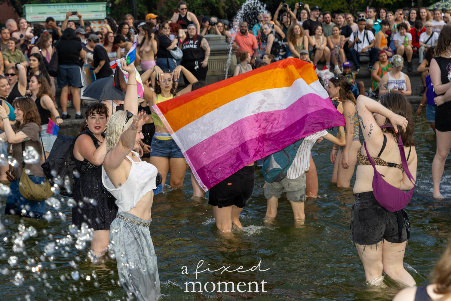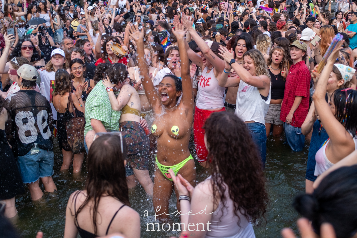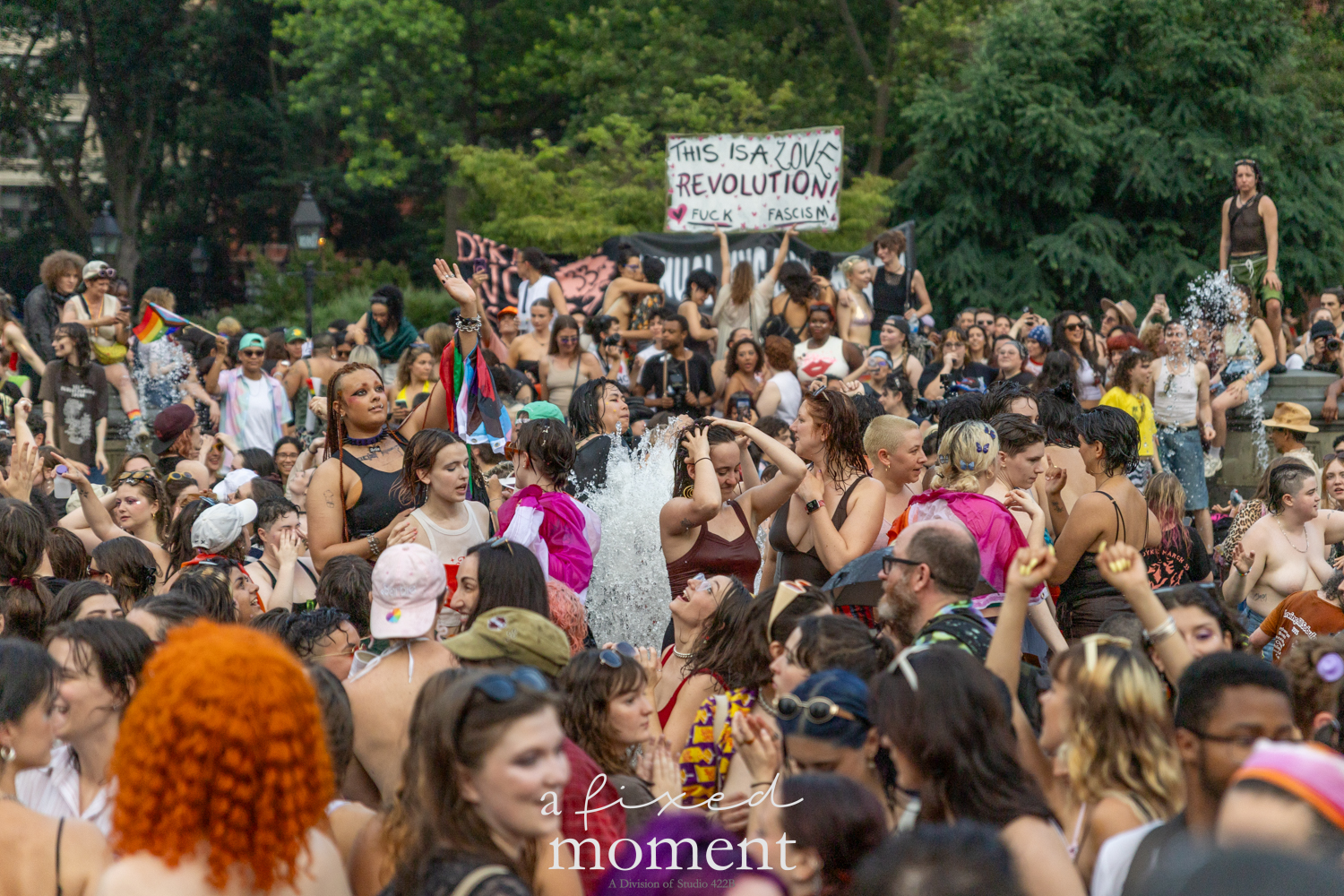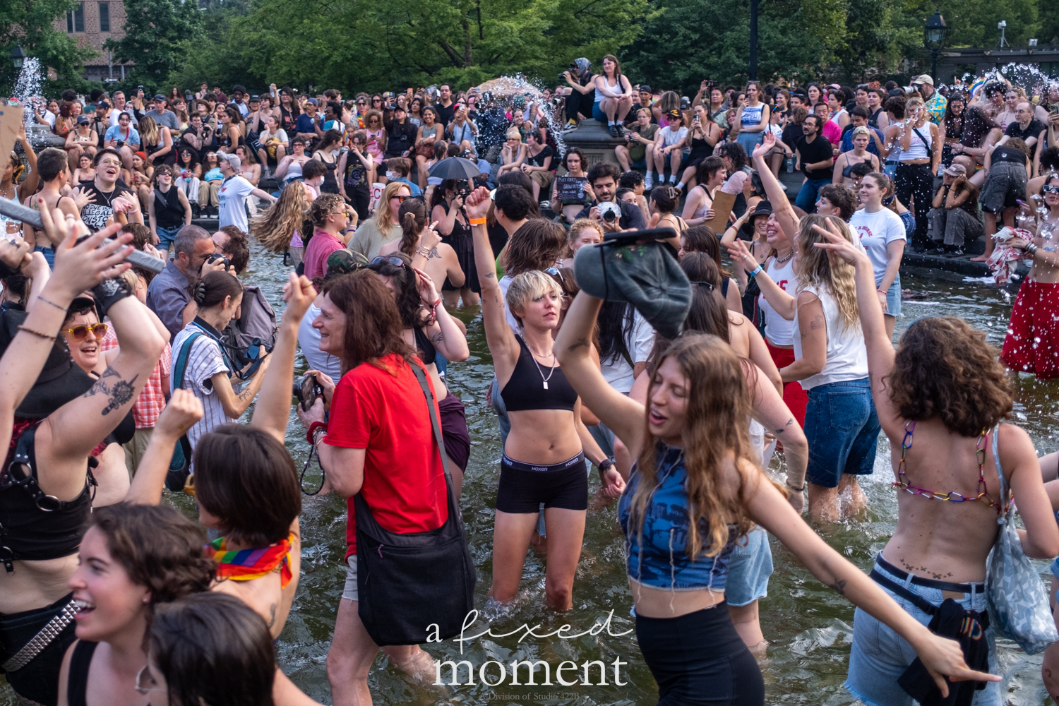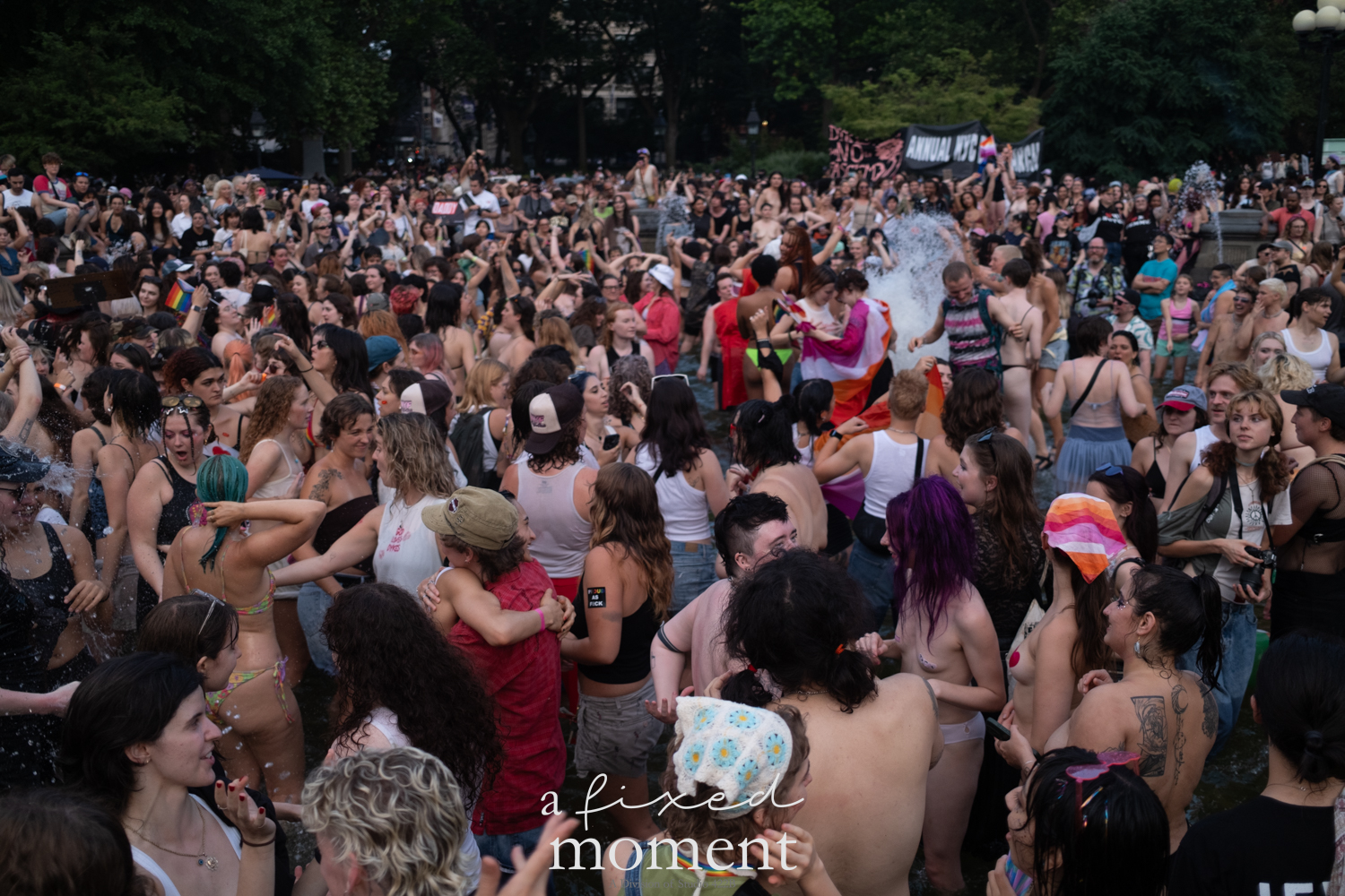 After the march, the spirit of resistance transformed into pure celebration. Thousands poured into the fountain, splashing in the water, draped in Pride flags, raising fists, dancing to music, and sharing chants that echoed off the Washington Square Arch. Some lifted banners high