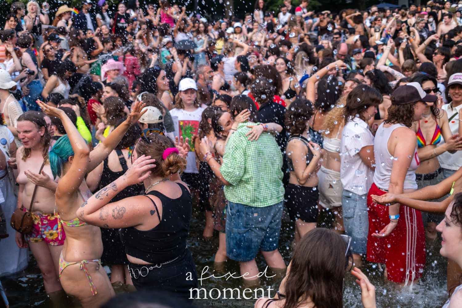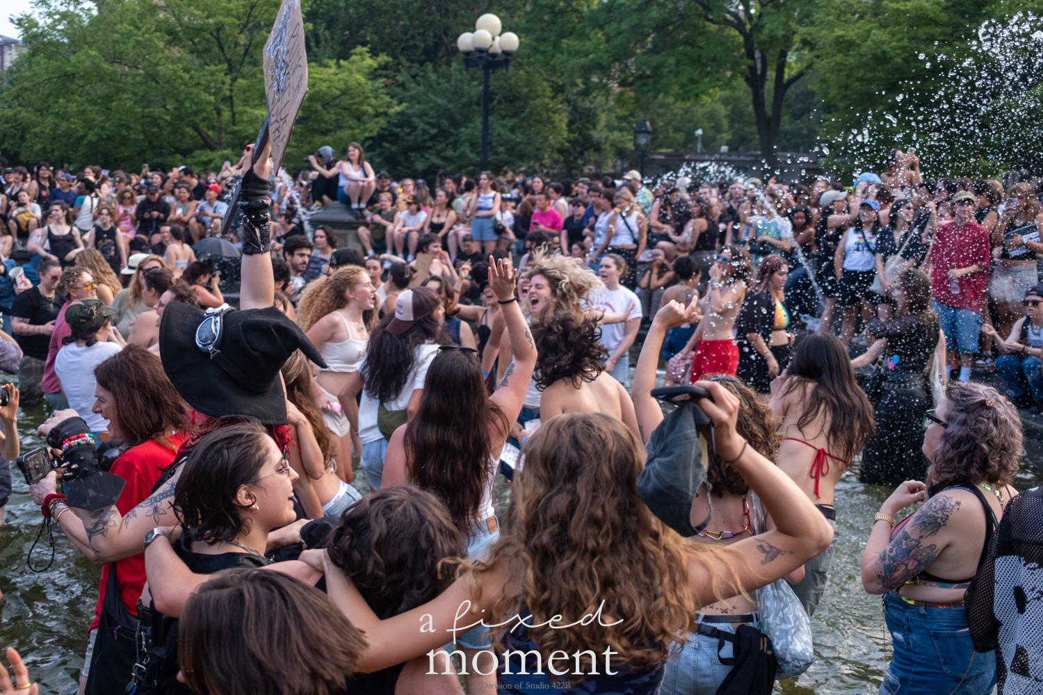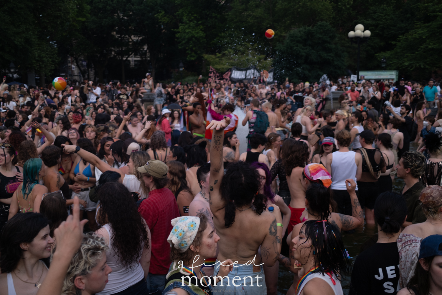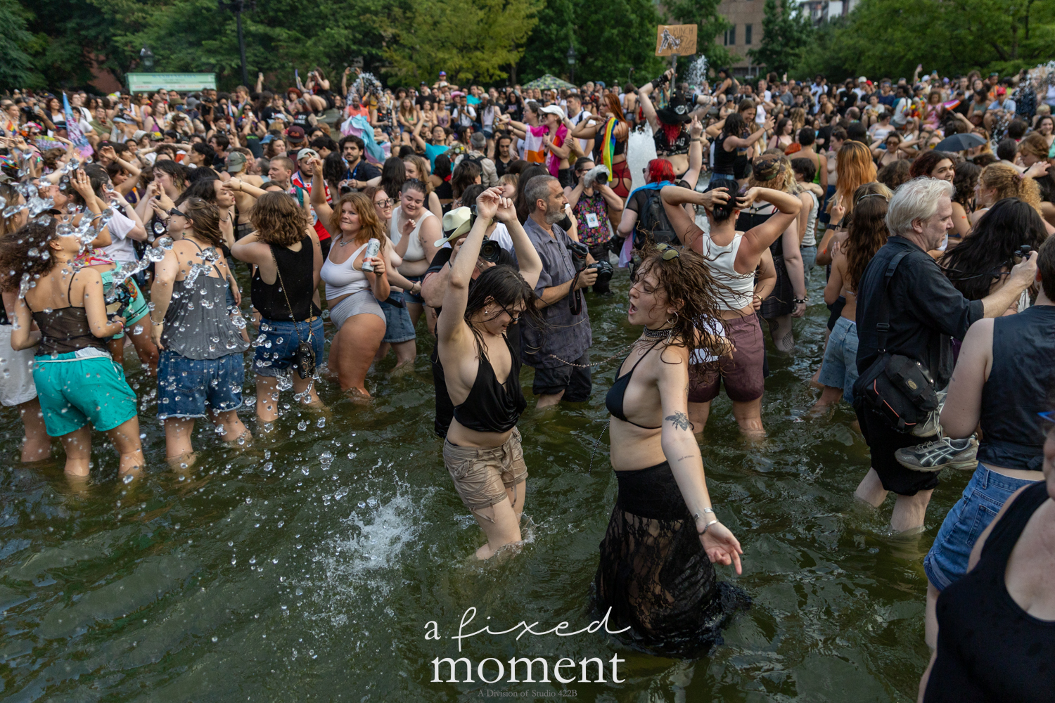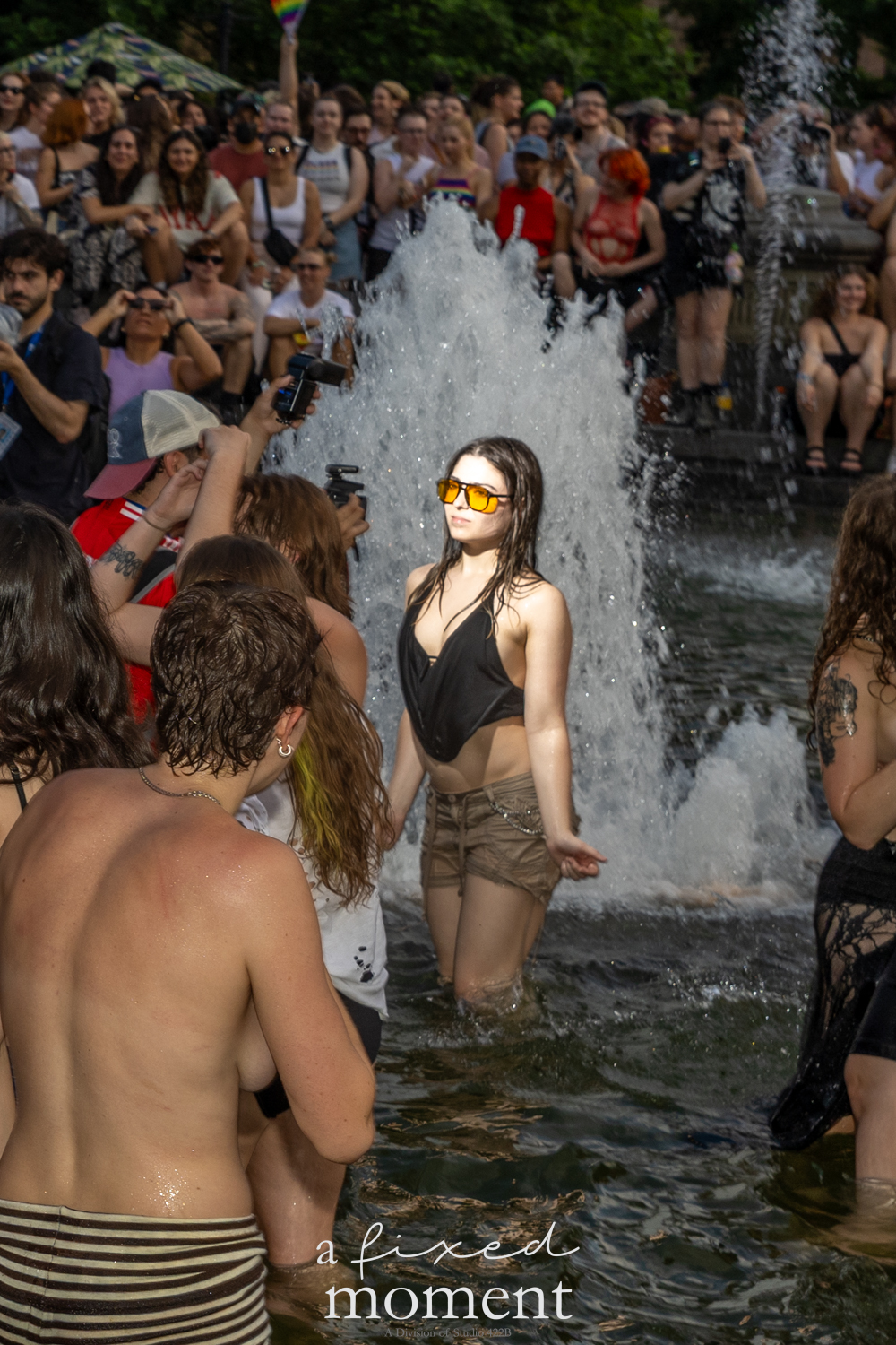 After the march, the spirit of resistance transformed into pure celebration. Thousands poured into the fountain, splashing in the water, draped in Pride flags, raising fists, dancing to music, and sharing chants that echoed off the Washington Square Arch. Some lifted banners high