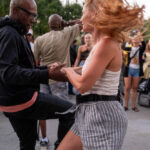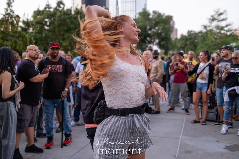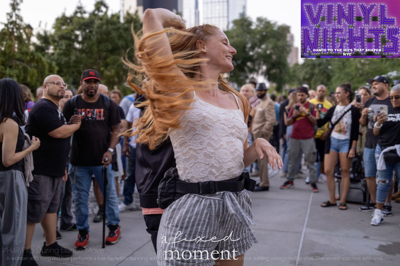 A woman with long red hair performs a hair flip while dancing with a partner. Her hair creates a motion blur, adding energy to the shot. The crowd watches with smiles as they enjoy the moment.