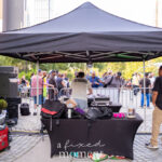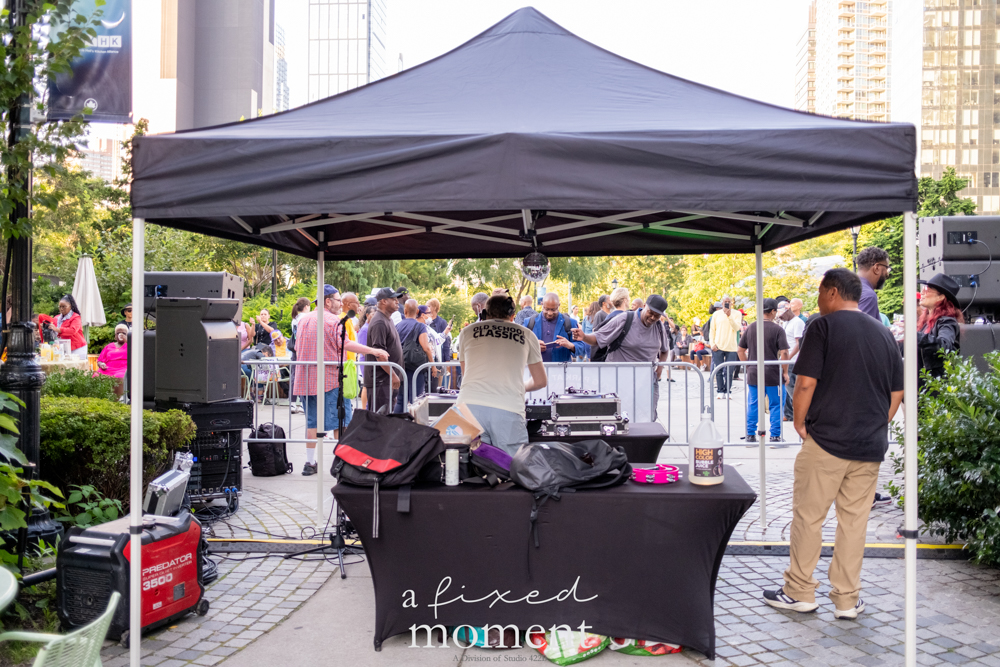 This image captures the DJ in the middle of a set, viewed from behind, under a black canopy tent at Vinyl Nights in Bella Abzug Park. The DJ, wearing an “Old School Classics” T-shirt, spins vinyl records as a crowd of attendees looks on, with some leaning on the barricades, waiting for the music to pick up.