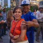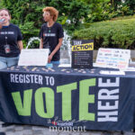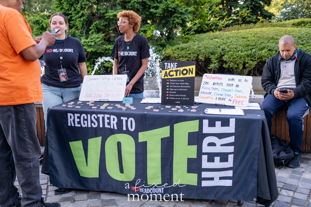 Two volunteers at a “Register to Vote” booth, engaging with a man while another person sits nearby. The volunteers are part of the HeadCount initiative, encouraging event-goers to take civic action while enjoying the event.