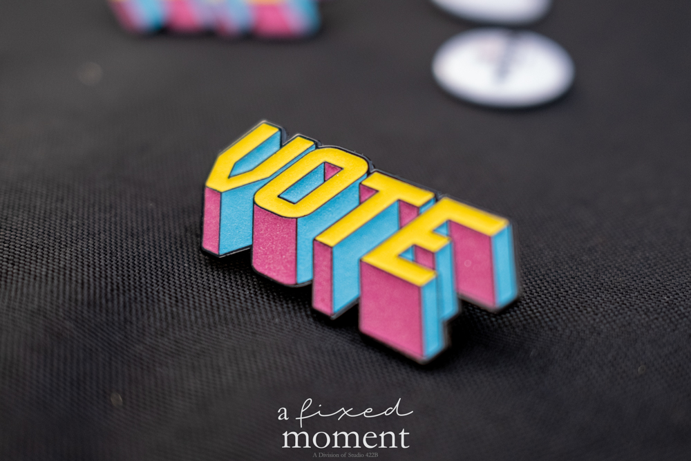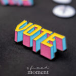 A close-up of a colorful retro-style “VOTE” pin lying on a black surface. The word is designed in yellow, pink, and blue, evoking a sense of fun and importance.