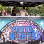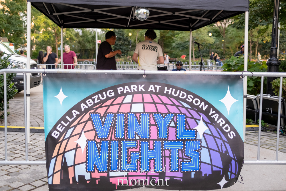 A wide shot of the Vinyl Nights banner displayed under the DJ tent at Bella Abzug Park. The banner features a disco ball and the event name, clearly advertising the evening’s theme of dance music.