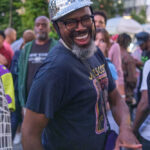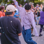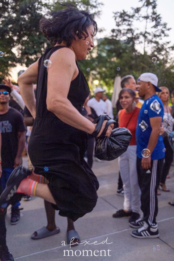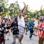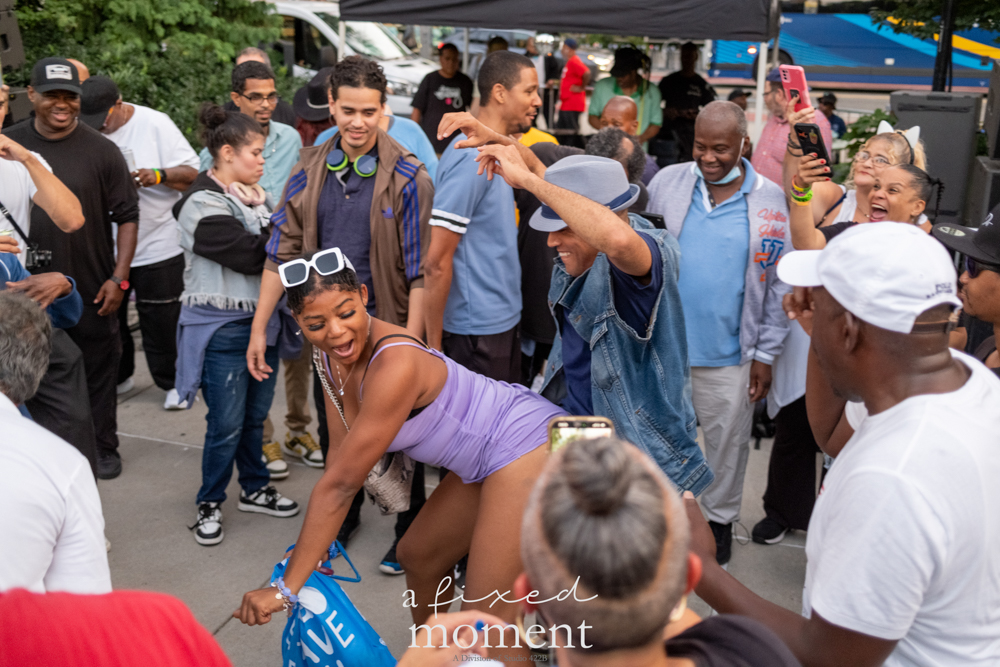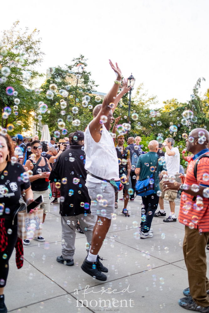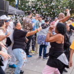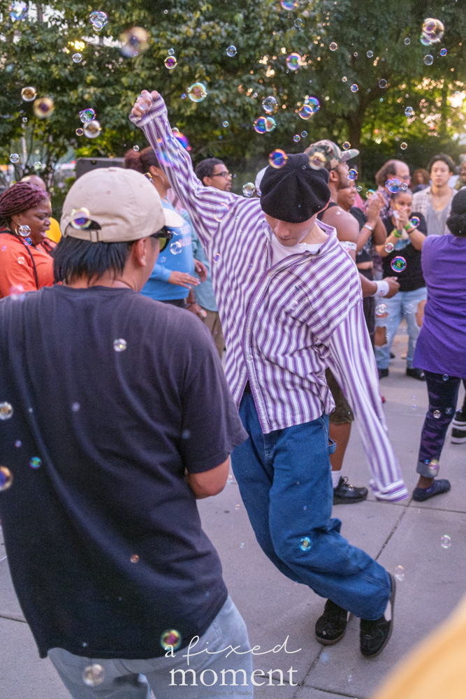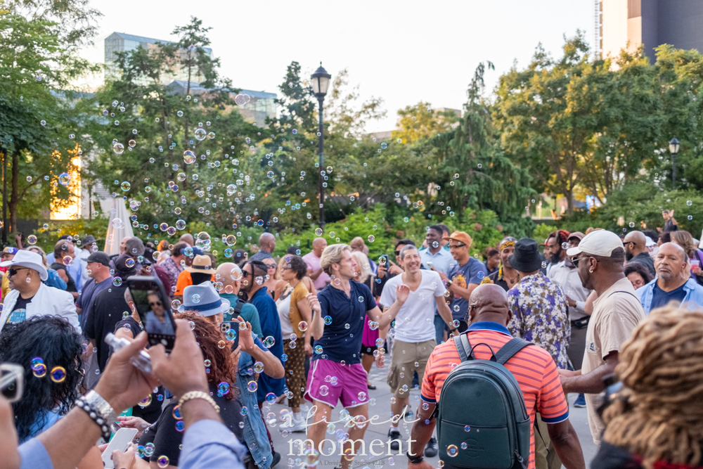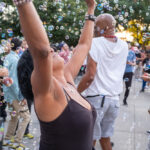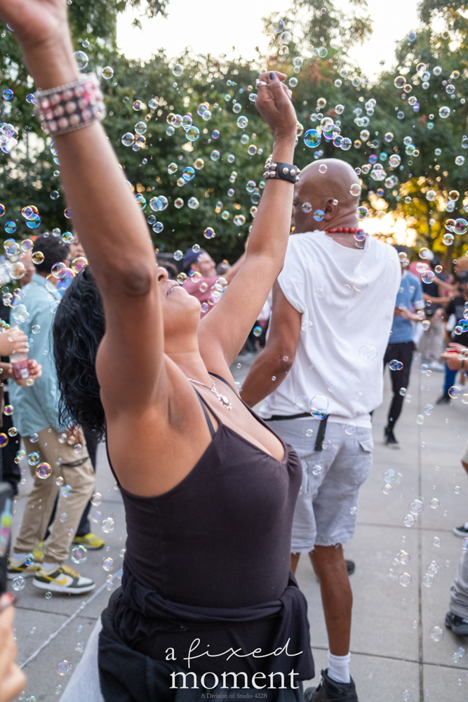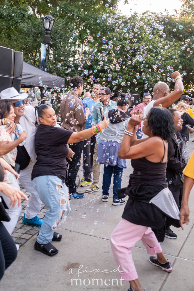 A diverse group of people is seen dancing with bubbles filling the air. The energy is high, and the crowd looks to be having a great time, immersed in the music and community atmosphere.