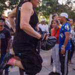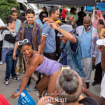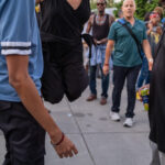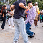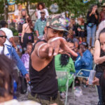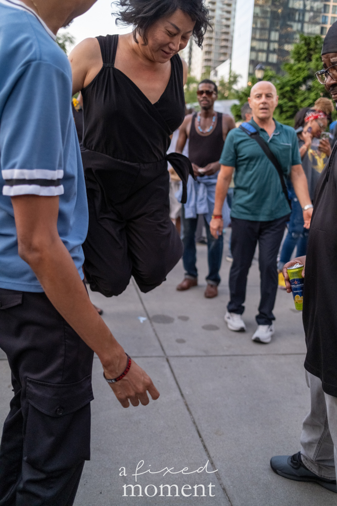 A dancer is caught mid-jump, dressed in a black outfit, in the middle of a performance. The crowd watches with interest, some smiling and enjoying the scene. The background includes people casually holding drinks and chatting, adding to the relaxed atmosphere.