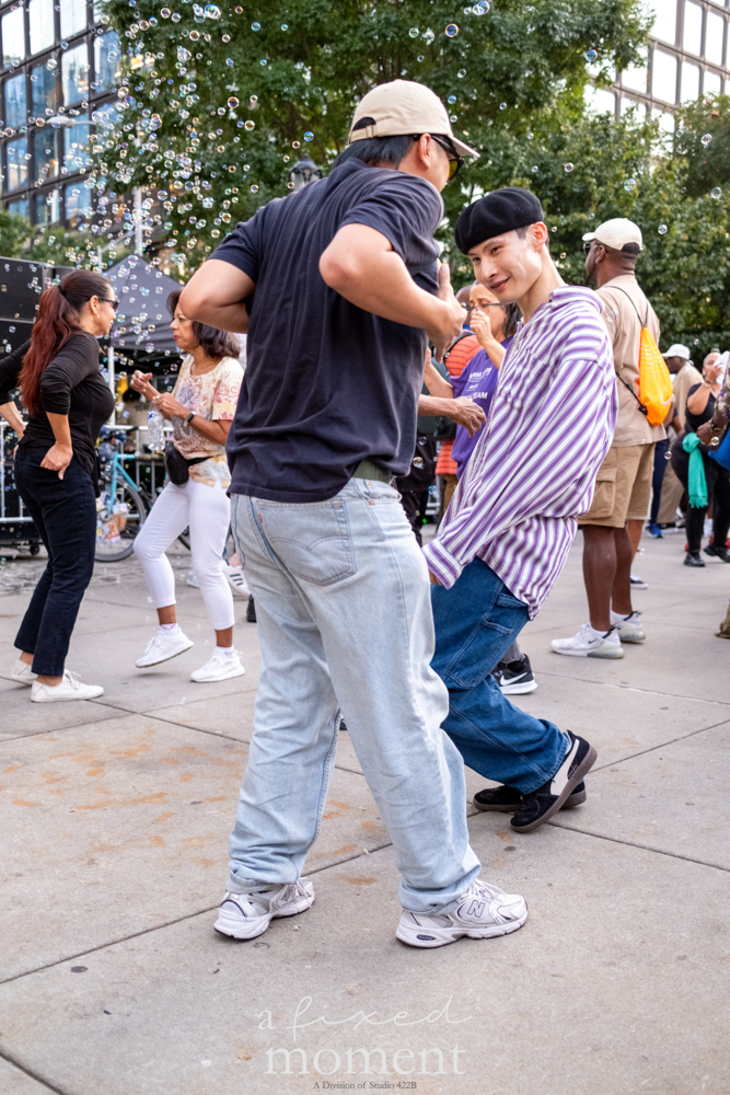 Two men are dancing energetically in the foreground. One is wearing a dark navy T-shirt and light blue jeans, while the other wears a purple-and-white striped shirt with baggy jeans and a black beret. The background shows more people dancing and enjoying the bubbles that fill the air, adding to the lively atmosphere.