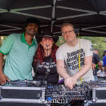 A group shot of three people behind the DJ booth: a man in a green polo shirt, a woman in sunglasses and a hat, and a DJ in a white graphic tee working the turntables. They are smiling, and the woman holds a whistle, adding to the sense of fun and festivity.