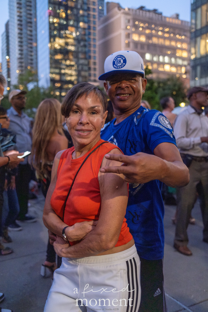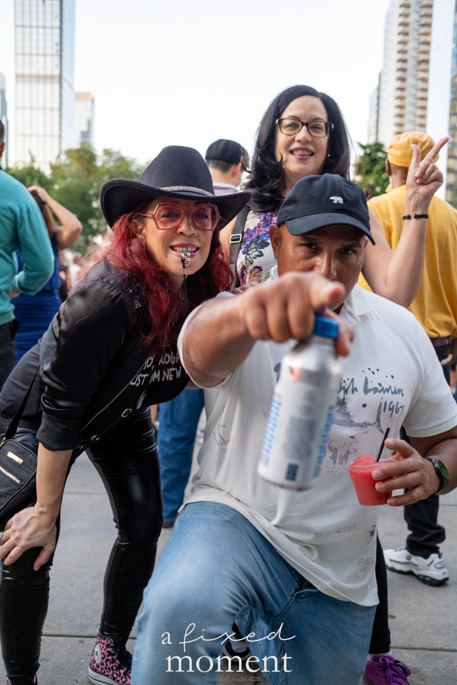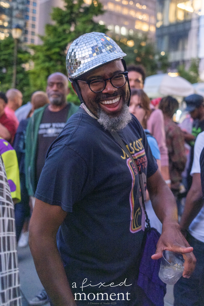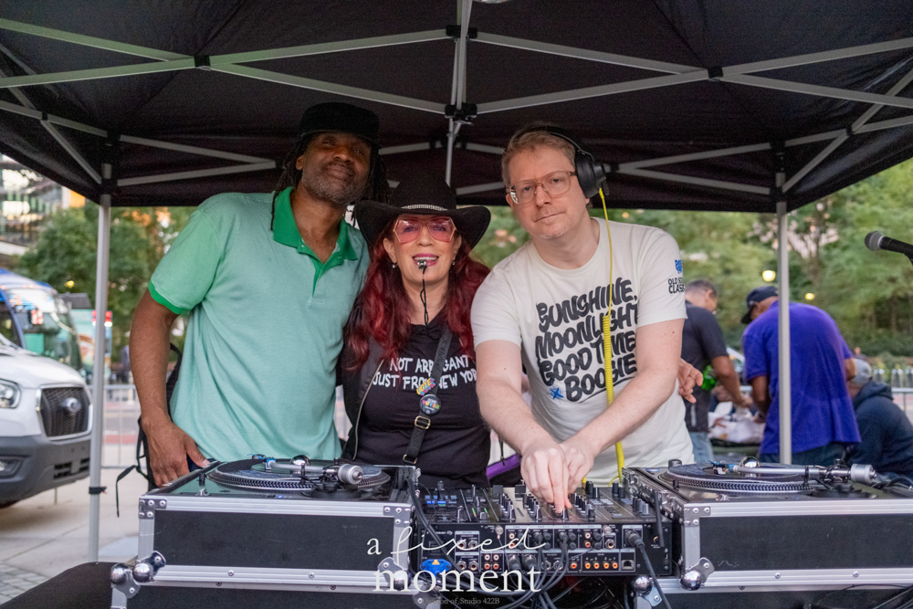 group photo, Vinyl Nights, Bella Abzug Park, cowboy hat, whistle, playful pose, outdoor music event, friends at a party, NYC dance party, casual outfit, smiling faces.