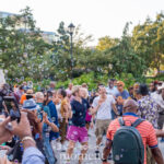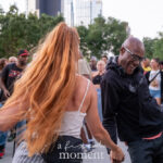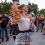 A dancer in a black dress is captured mid-performance, interacting playfully with another event attendee. The crowd is lively, with people smiling and capturing the moment. The dancer’s expression is full of joy and enthusiasm, highlighting the dynamic interaction.