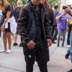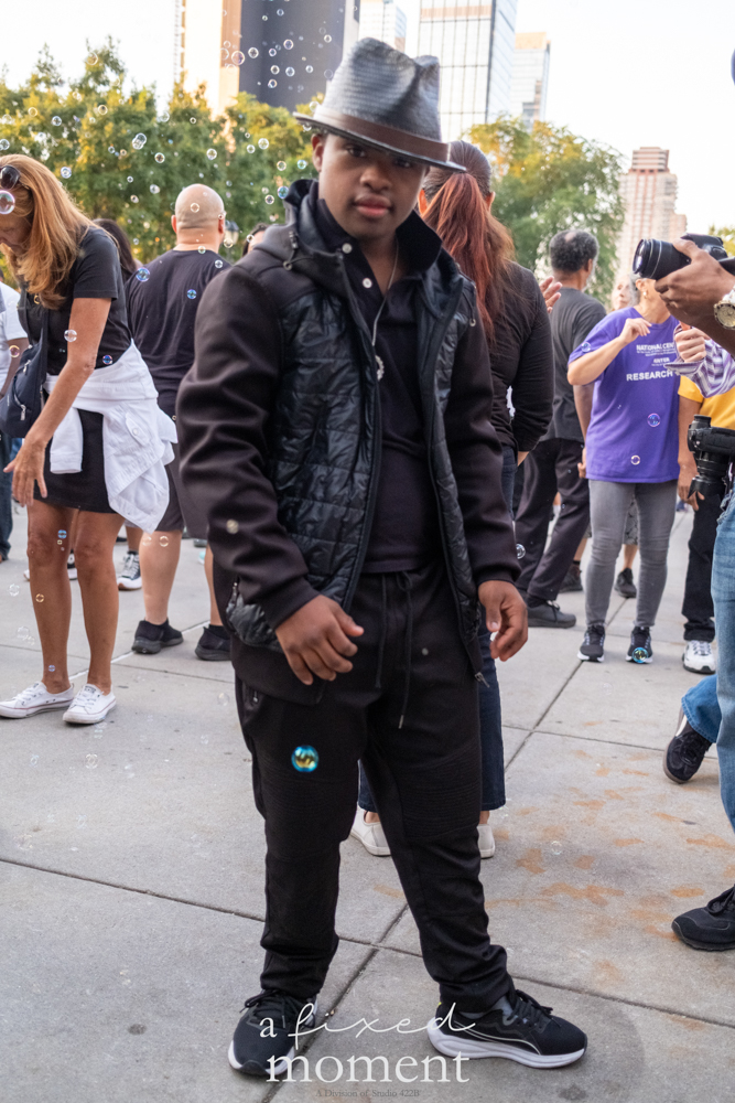 A young man in a black outfit with a puffy vest and fedora stands at the event, looking confidently at the camera. The background shows people dancing, and bubbles fill the air.