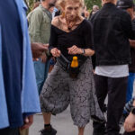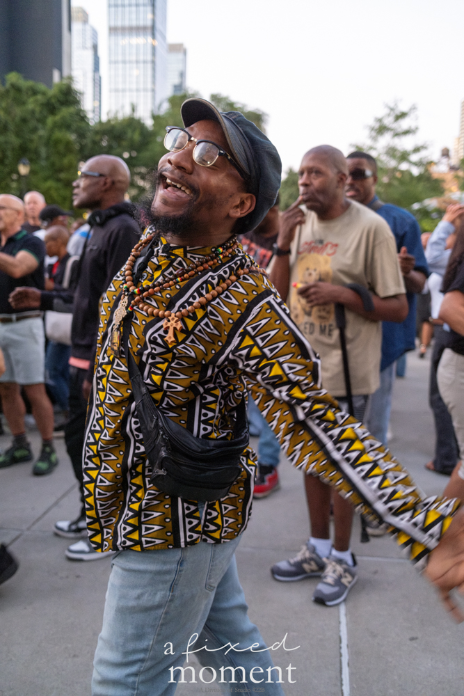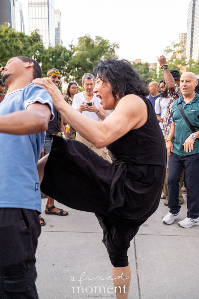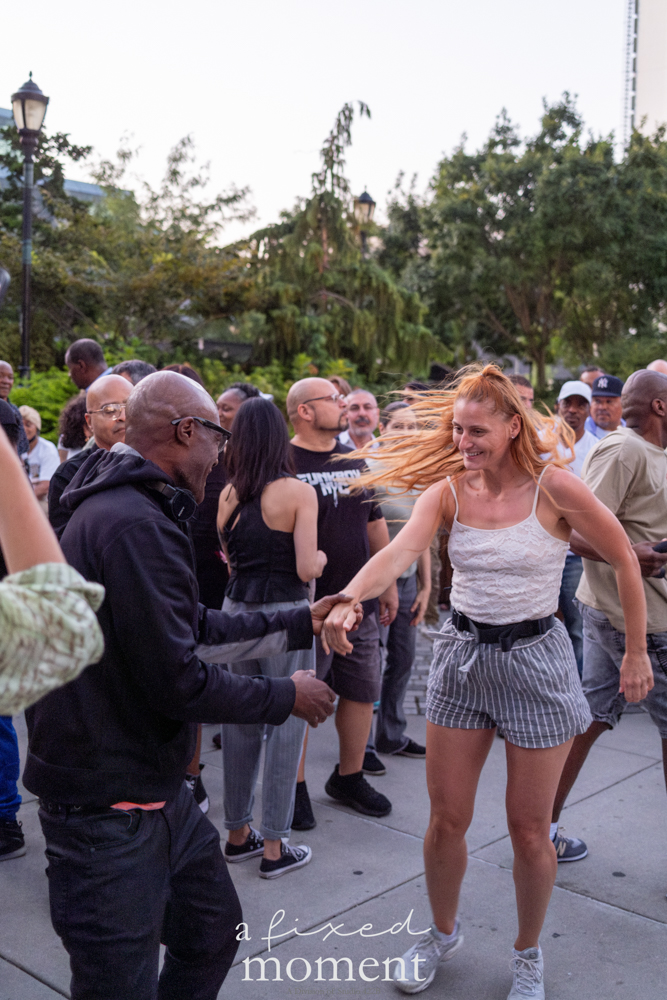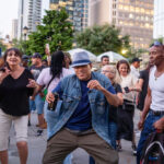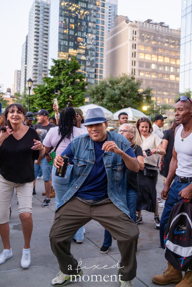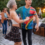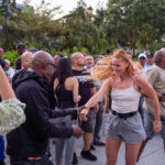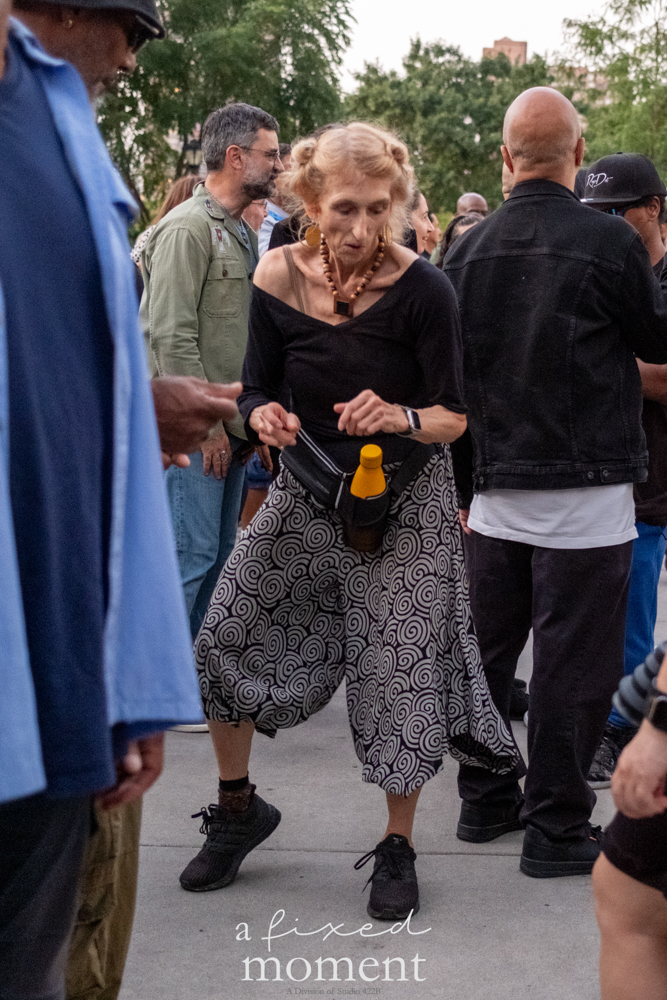 An older woman wearing a black top and patterned pants dances freely in the crowd. Her focus is entirely on the music as she moves, showing the inclusive and multigenerational nature of the event.