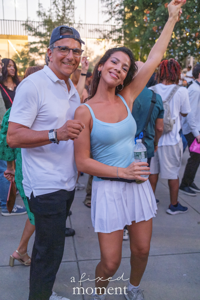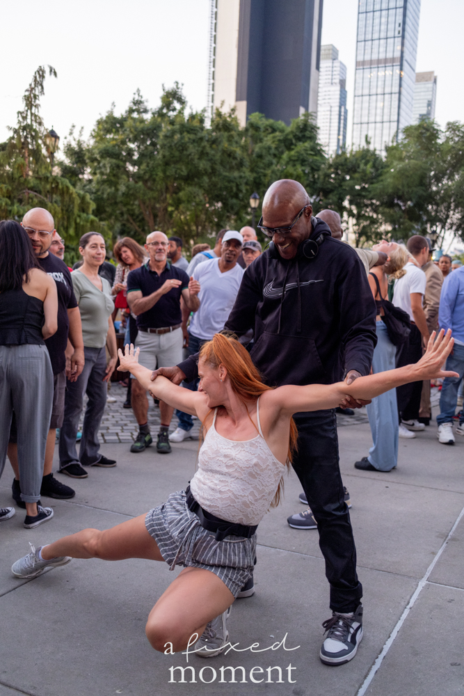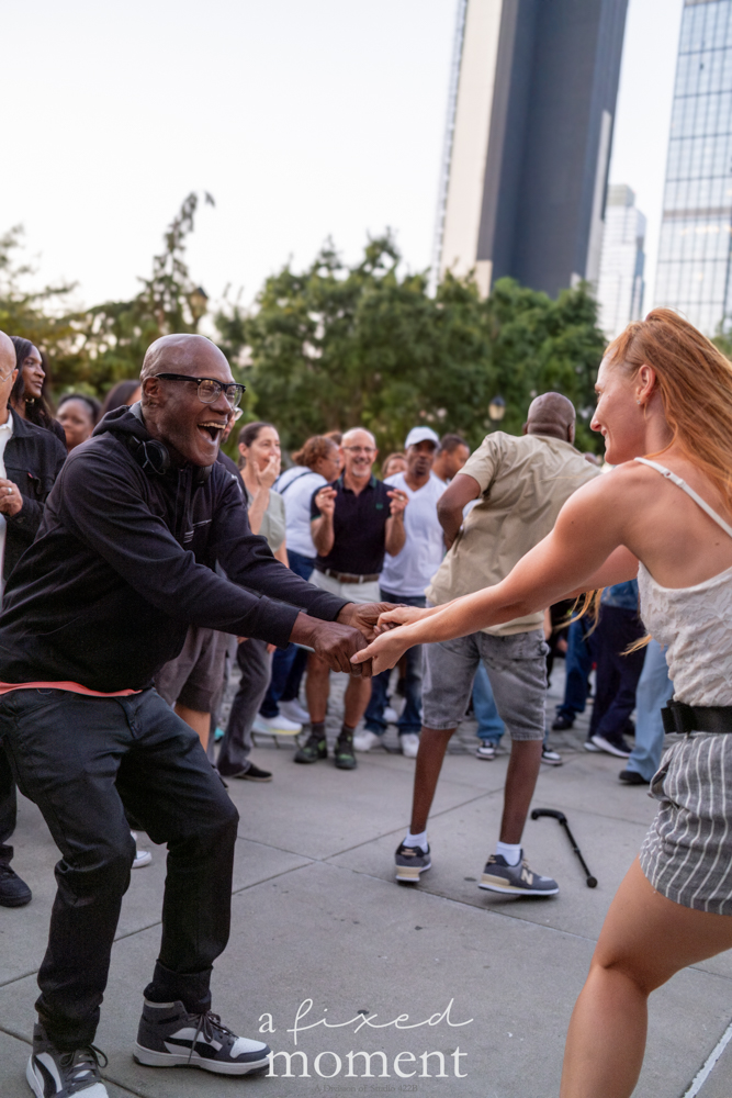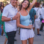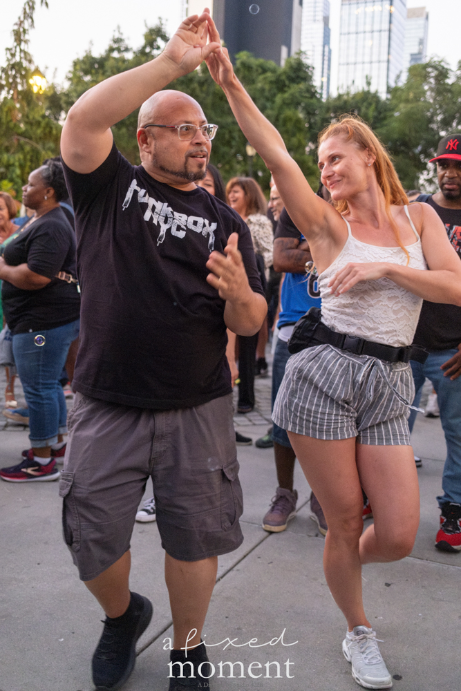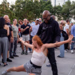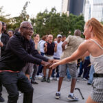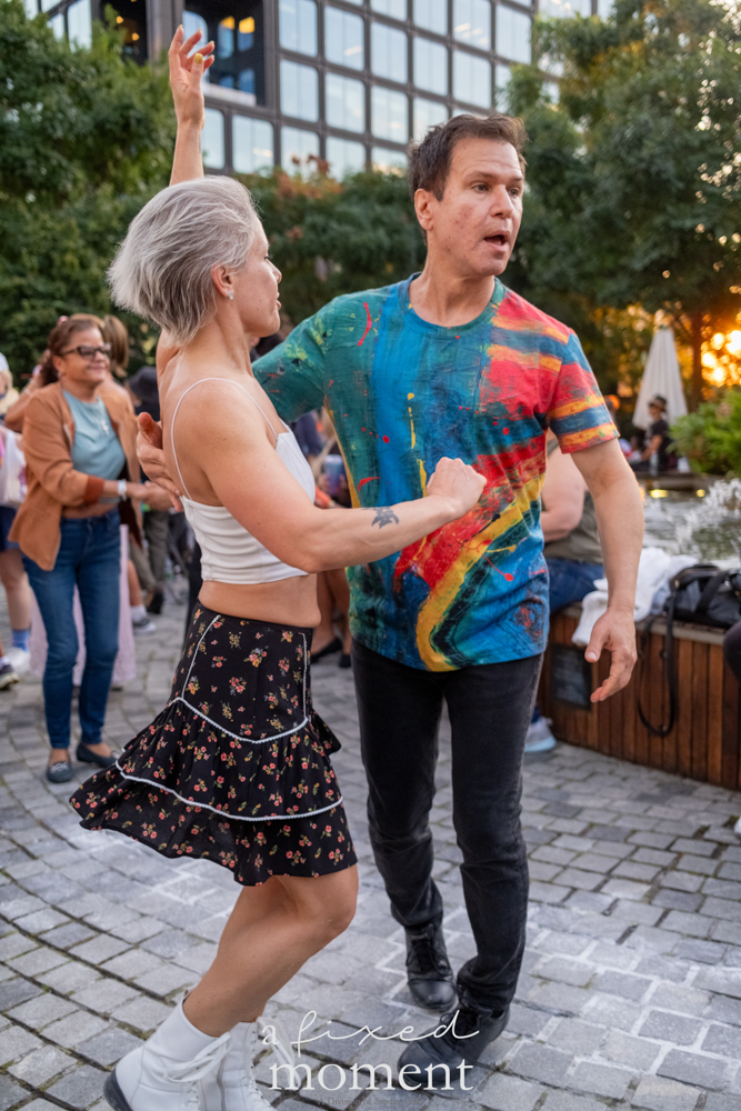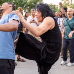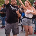 A man and woman are dancing in sync, with the woman raising her arm in rhythm. She wears a white crop top and a floral skirt, while the man wears a colorful, abstract patterned T-shirt and black pants. The lively crowd and park setting provide the background.