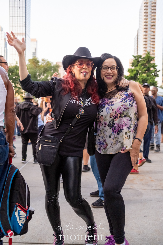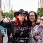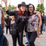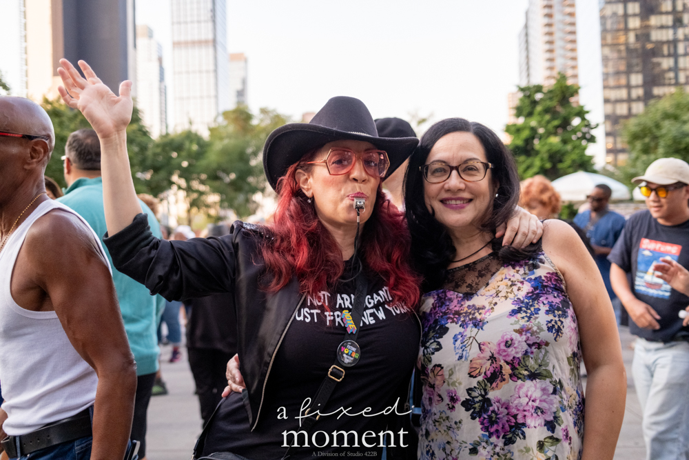 A woman with red hair and a black cowboy hat poses with her arm around a friend, smiling widely. She wears a black shirt that reads, “Not for anything, just from New York.” Bubbles float in the air, and more people enjoy the event in the background.
