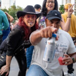 A group of friends poses for a photo, with one woman in the foreground wearing a cowboy hat and blowing a whistle. Another person points playfully toward the camera. The background is filled with other attendees, adding to the event’s busy, fun atmosphere.
