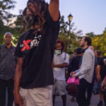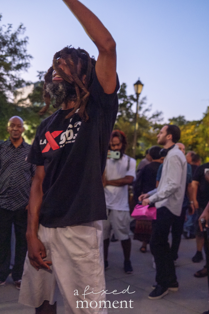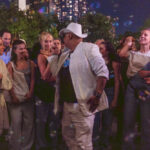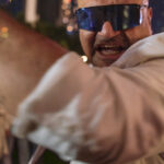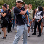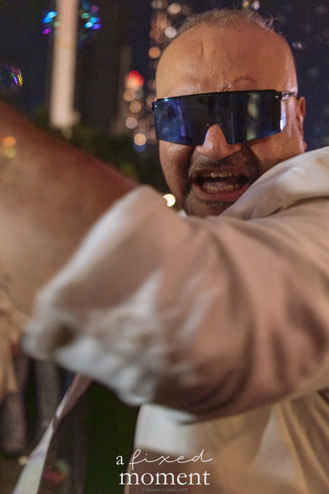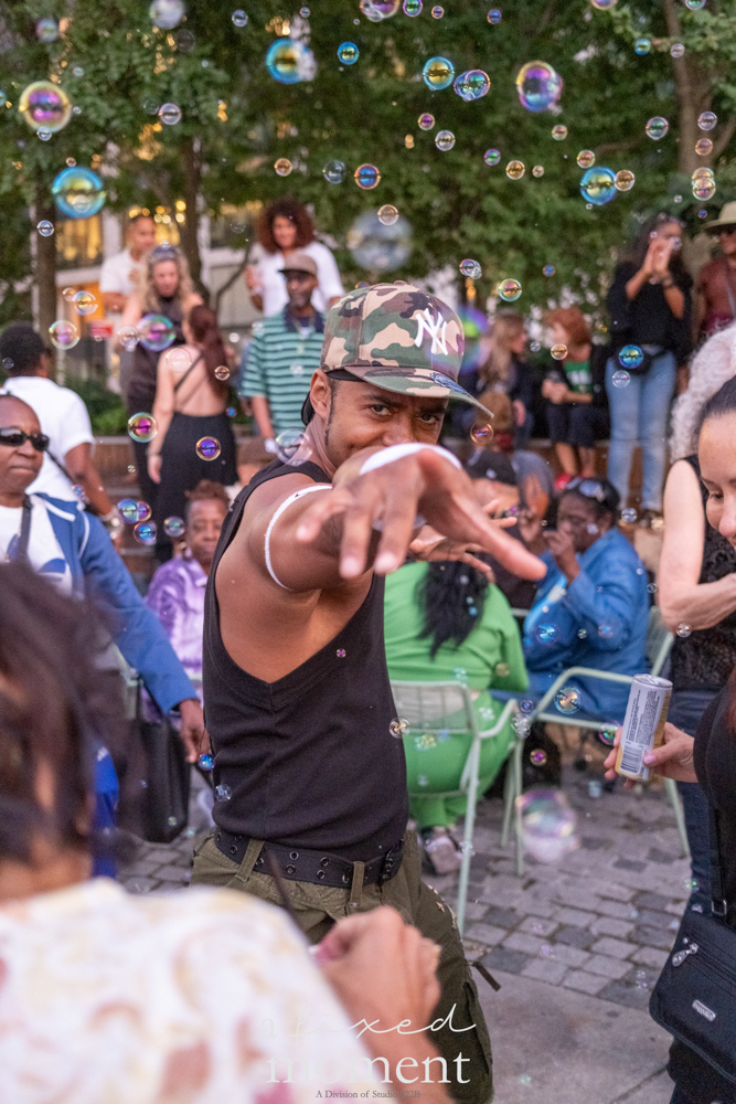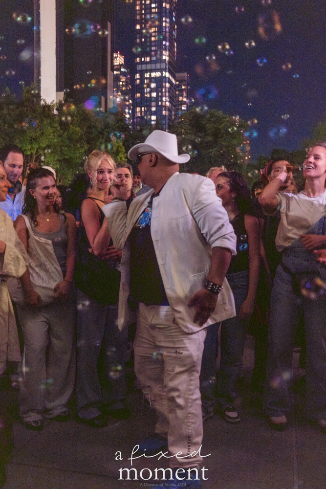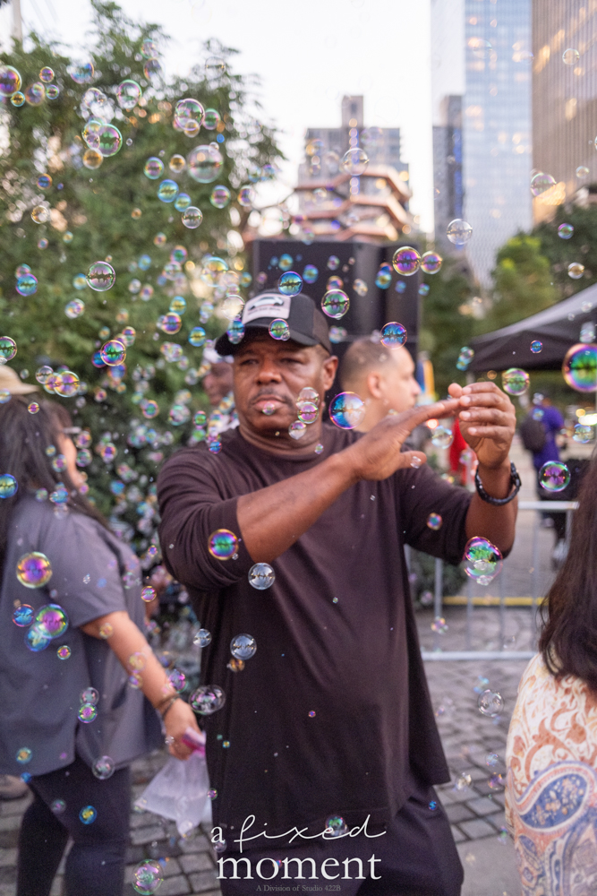 A man in a camouflage “NY” hat points directly at the camera with a playful expression, surrounded by bubbles and a crowd of people. His tank top and casual style add to the street vibe of the event.