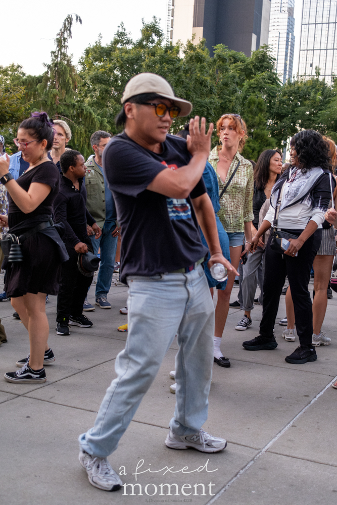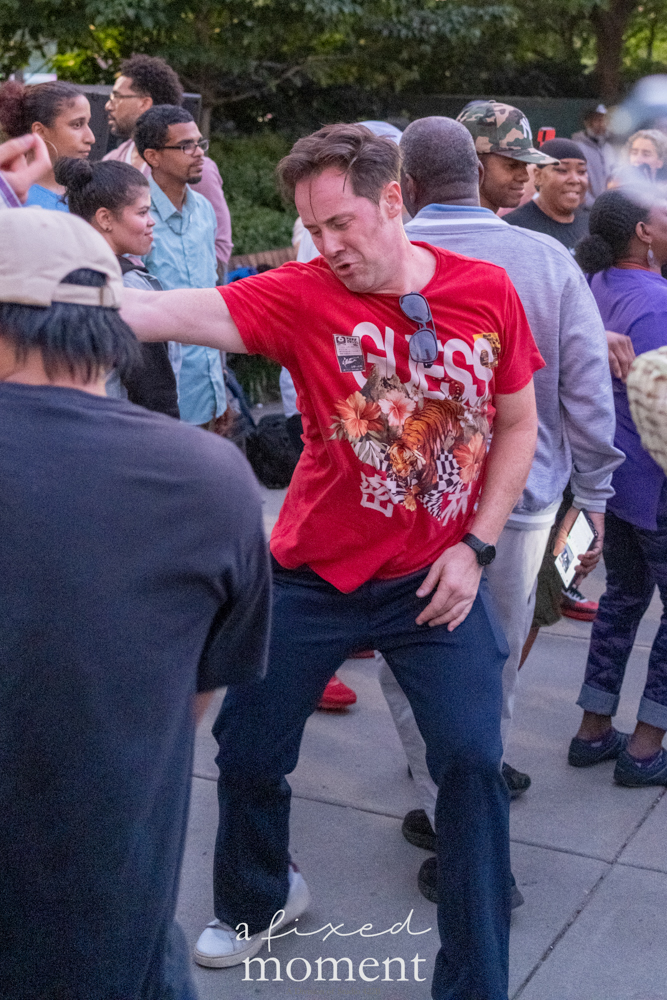 A man wearing a baseball cap, sunglasses, and a black T-shirt moves smoothly to the music. His body language shows confidence and joy as he dances in the middle of the crowd.