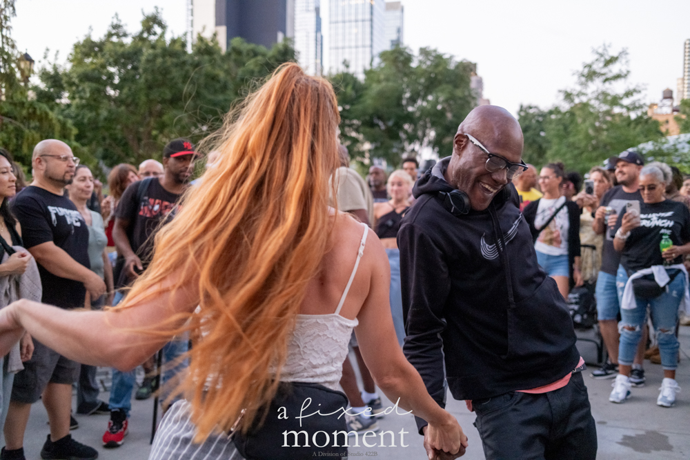 A woman with long red hair and a man in a black hoodie dance together, smiling and enjoying the music. The woman’s hair flows with her movement, adding a dynamic element to the photo, while the man smiles warmly.