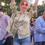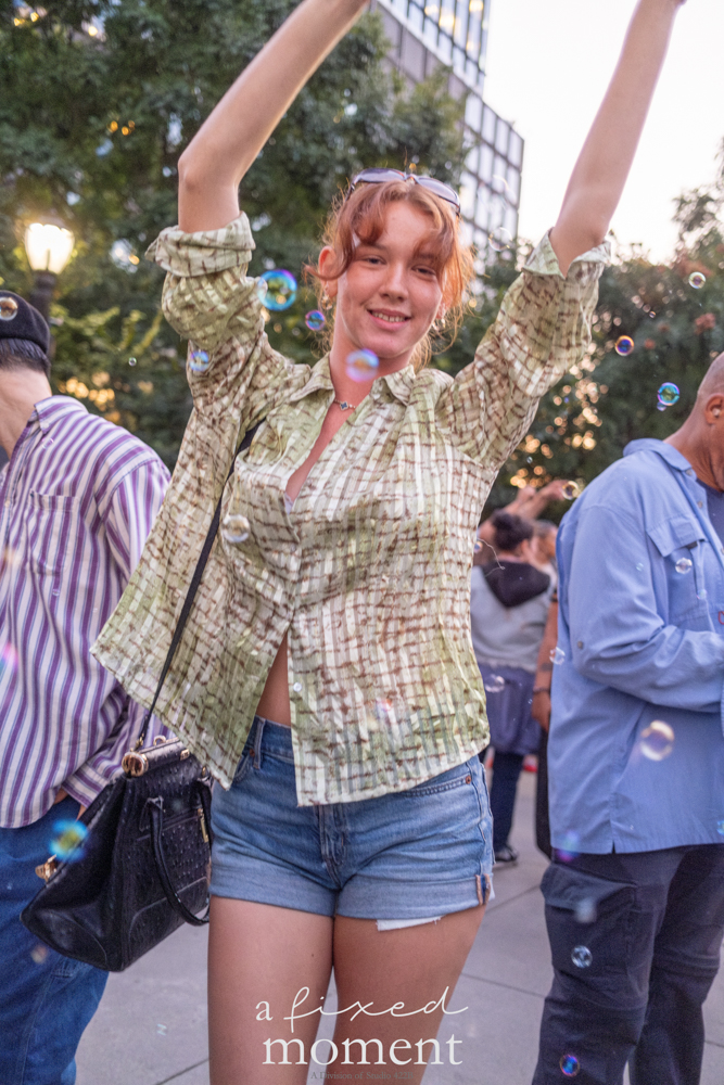 A woman with raised arms dances under a shower of bubbles, enjoying the music and festive atmosphere. Her body language exudes freedom and joy as she embraces the lively environment of Vinyl Nights.