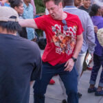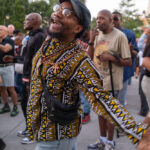 A man wearing a brightly patterned shirt dances enthusiastically. His wide smile and the colorful shirt stand out against the backdrop of the crowd. His arms are spread wide as he fully embraces the music.