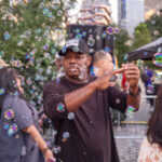 A man wearing a black shirt and baseball cap reaches out to pop soap bubbles floating in the air. He seems to be enjoying the playful atmosphere of Vinyl Nights, with the city skyline visible in the background. People around him smile and move to the music, enjoying the vibrant event.