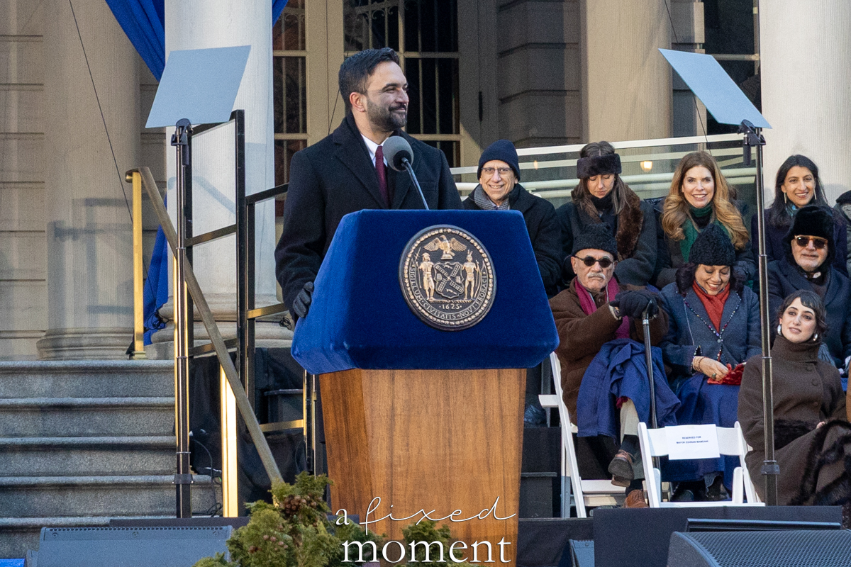 Following the oath, Mayor Mamdani delivered his inaugural address from the podium as attendees throughout the plaza listened attentively, some watching from a distance while others stood closer to the steps of City Hall.